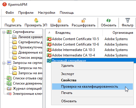 - контекстное меню в главном окне программы (такая проверка только для сертификатов, установленных в хранилище)