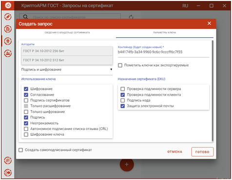 - При установке флага Создать самоподписанный сертификат происходит создание сертификата и его автоматическая установка в личное хранилище пользователя. Запросы на самоподписанные сертификаты не создаются.